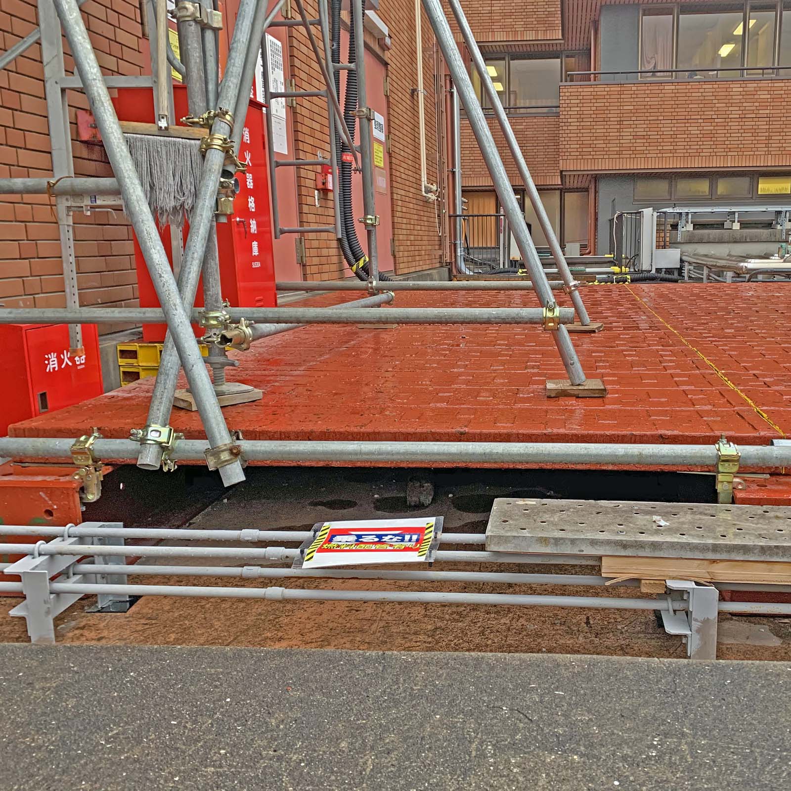病院屋上を資機材置場とする際に屋上床板の養生・既設燃料管の保護のため構台を設置